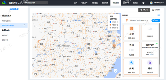 4、風吸式茶園殺蟲燈支持手機App與Web端控制,具有豐富的狀態(tài)信息展示,足不出戶就可以了解一切,如地理位置、設備編號、基地名稱、物聯(lián)網(wǎng)卡卡號、剩余流量、卡有效期、GSM天線連接是否正常等故障報警信息。可遠程控制、查看設備的當前工作狀態(tài)、信號強度、電量使用等情況。