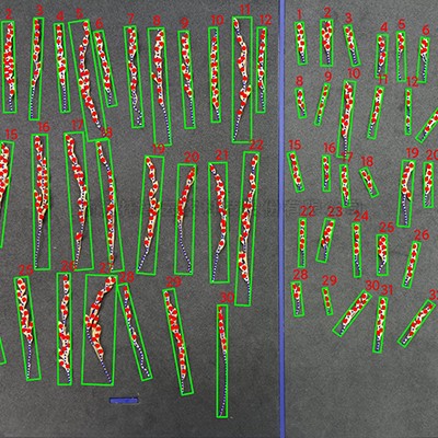 7、顏色對比標(biāo)記功能:系統(tǒng)對稠密難辨別的稻穗數(shù),可用兩種顏色進行對比標(biāo)記,便于區(qū)分。水稻小穗長度可用長方形的框代替,穗粒數(shù)可用紅色的圓點進行標(biāo)記,便于觀察。