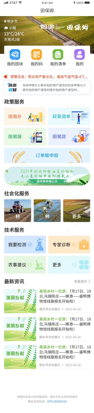 桐鄉(xiāng)是浙北重要糧食生產(chǎn)基地,糧食總產(chǎn)穩(wěn)定在13萬噸以上,種植面積穩(wěn)定在30萬畝以上,種糧農(nóng)戶1.6萬多戶。生產(chǎn)過程中發(fā)現(xiàn)缺少快速服務(wù)入口、惠農(nóng)政策申辦繁瑣、流程審批復(fù)雜以及找技術(shù)困難等問題?!疤锉D贰倍ㄎ辉谵r(nóng)民最關(guān)心的“一件事”上,包含土地、氣象、農(nóng)技、農(nóng)資、農(nóng)機、金融、保險、補貼等都是解決農(nóng)民最著急的問題。