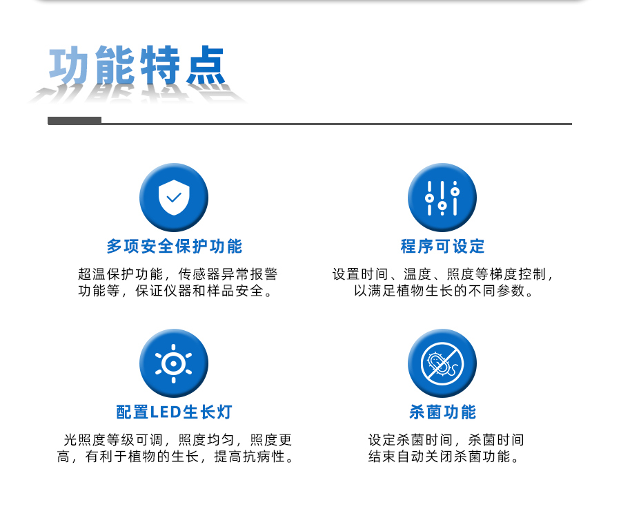 4、種子發(fā)芽培養(yǎng)箱具有超溫和傳感器異常保護(hù)功能,保證儀器和樣品安全,配置LED生長燈,照度更均勻,照度更高,有利于植物的生長,提高抗病性。